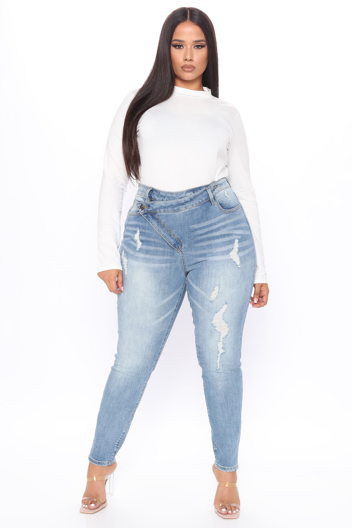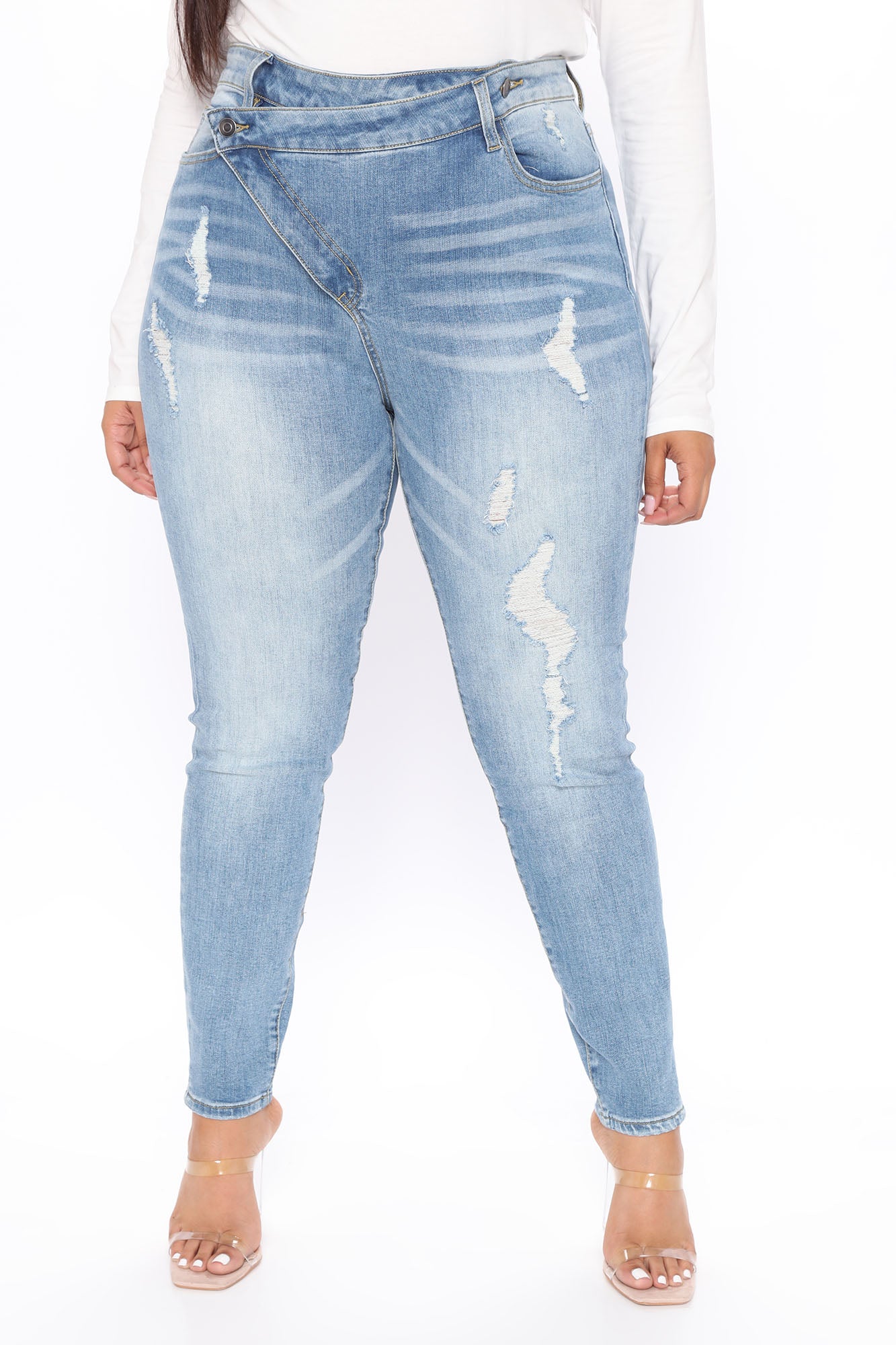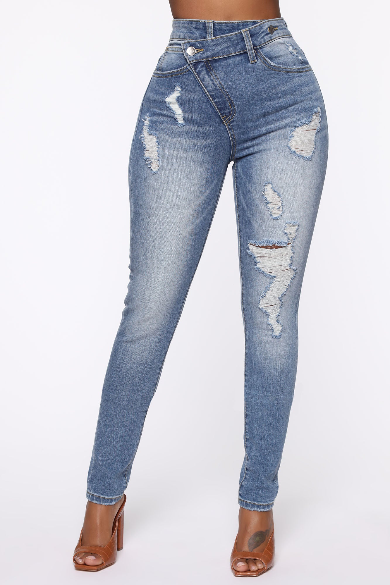 • From A Distance Crossover Mid Rise Skinny Jeans - Medium Wash