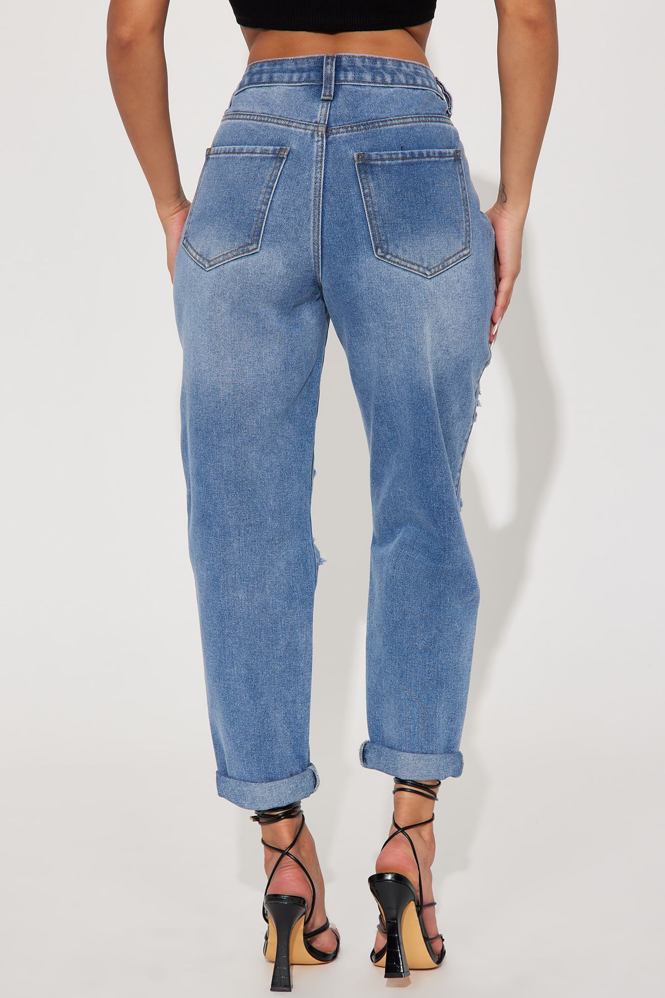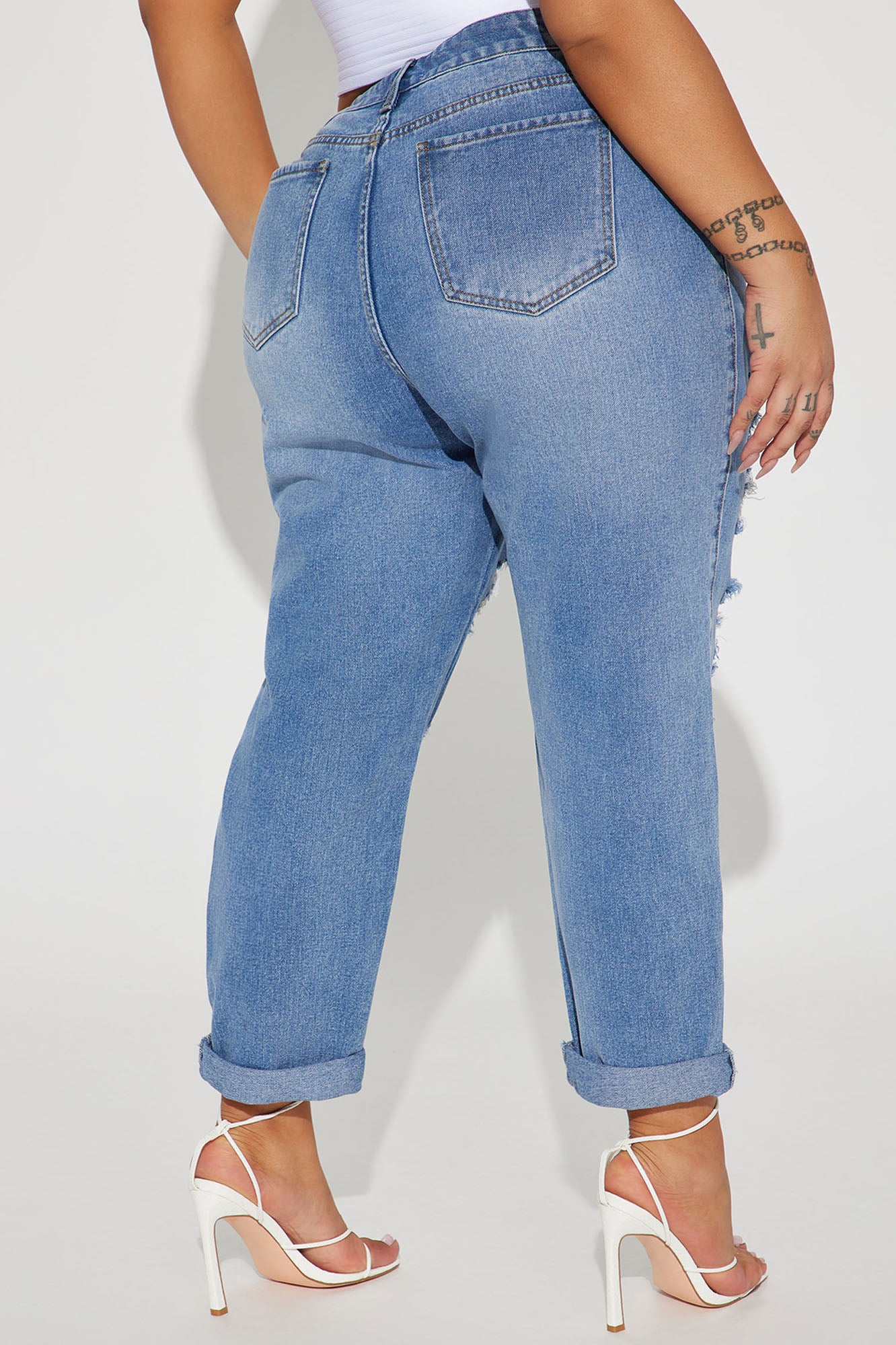 • Get A Clue Ripped Non Stretch Mom Jeans - Medium Wash