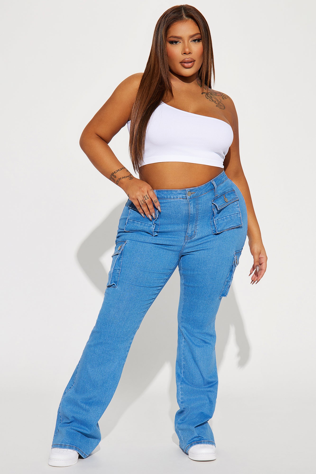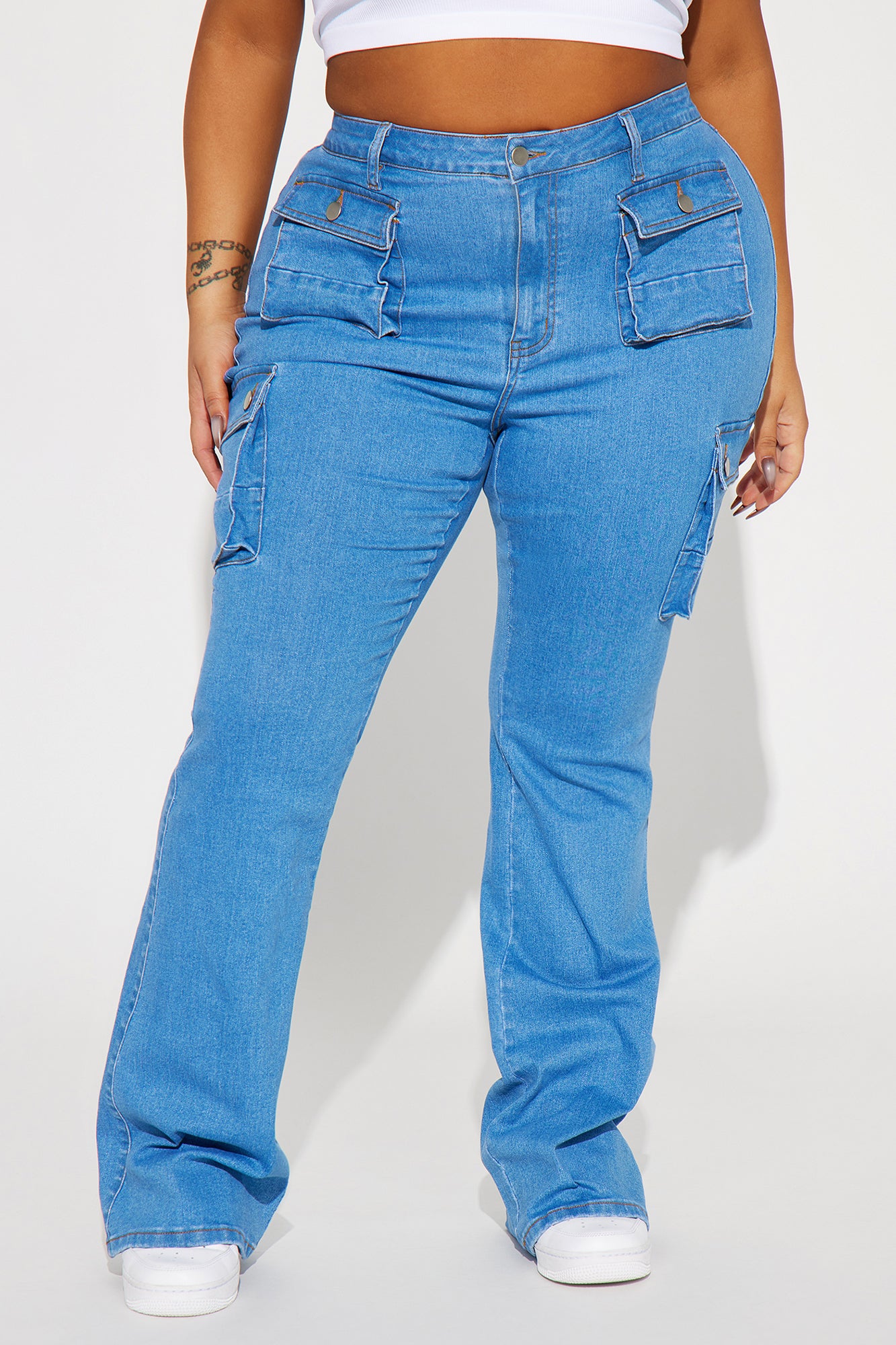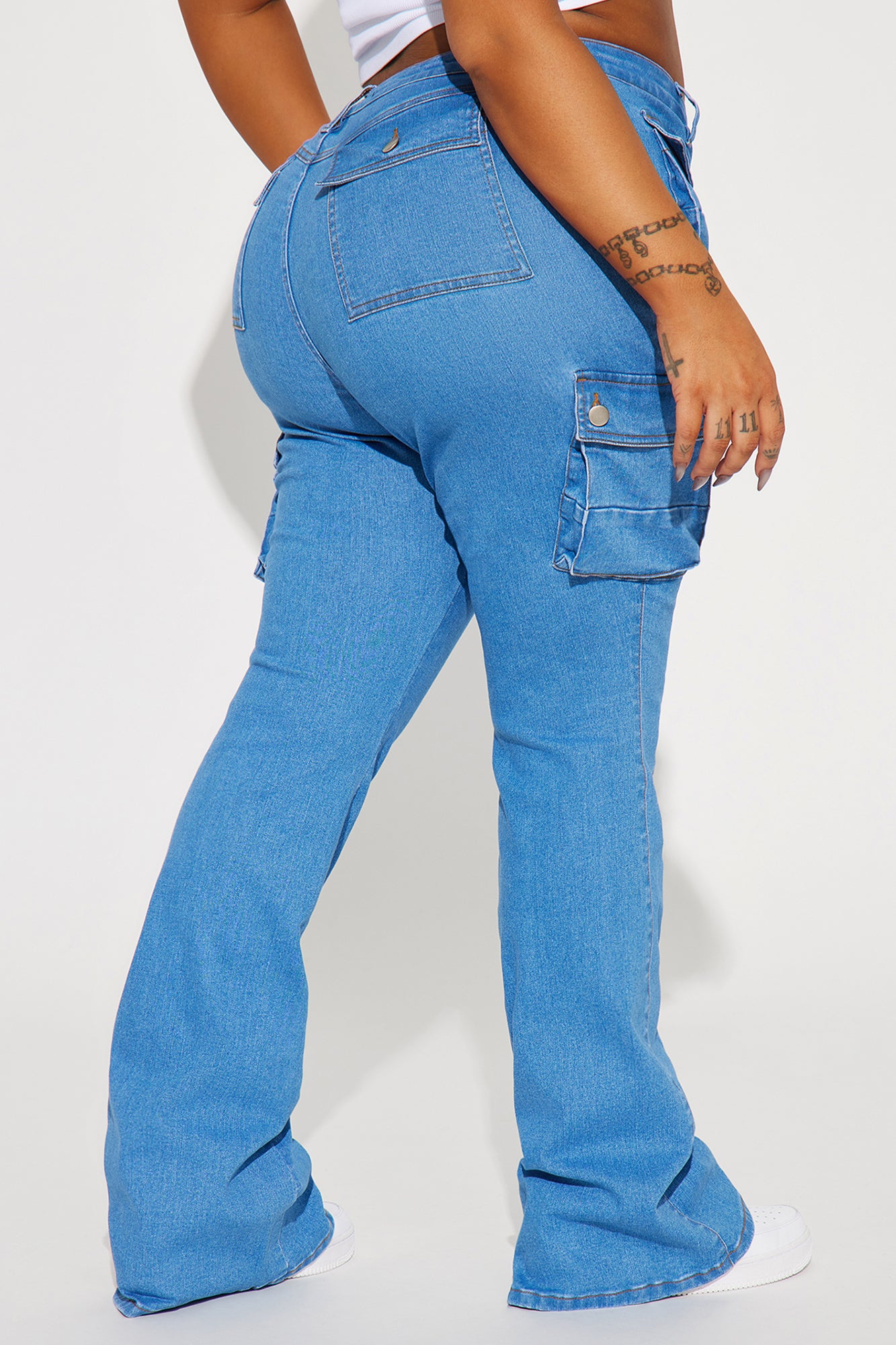 Late Nights Mid Rise Cargo Flare Jeans - Medium Blue Wash