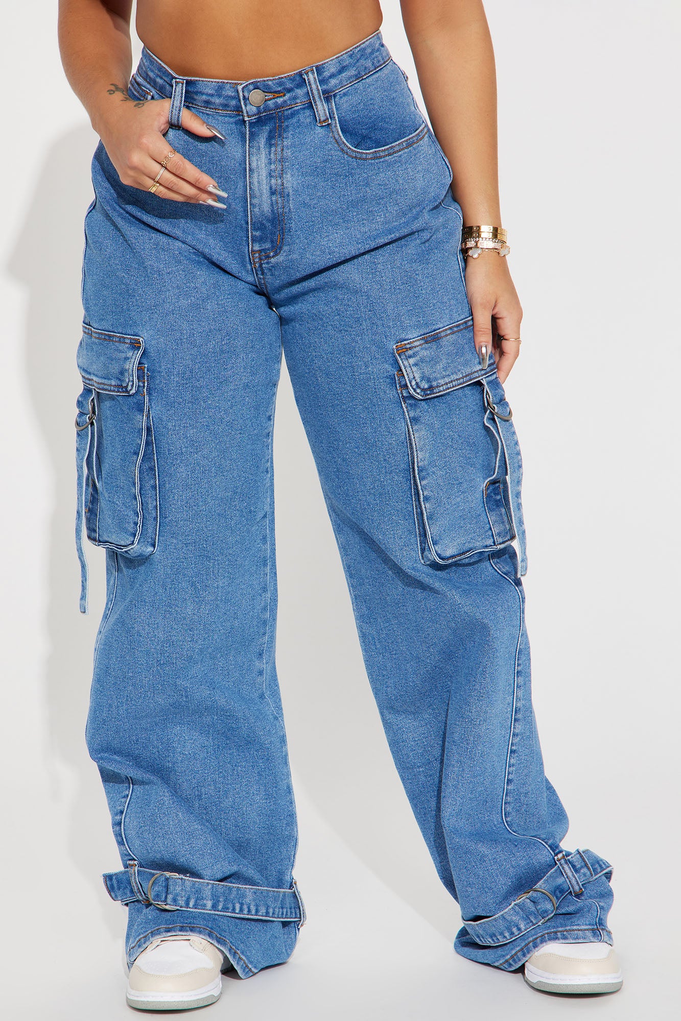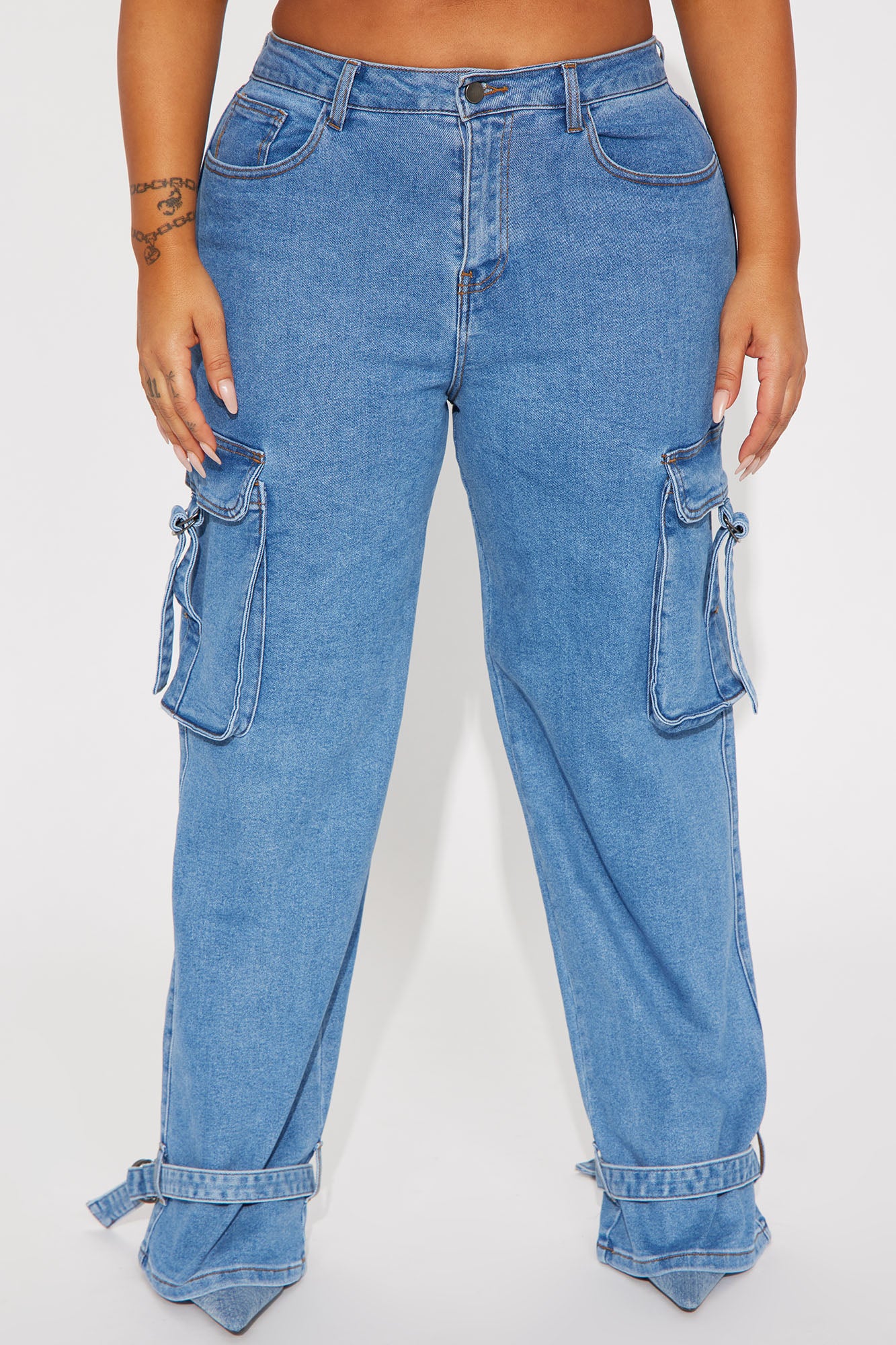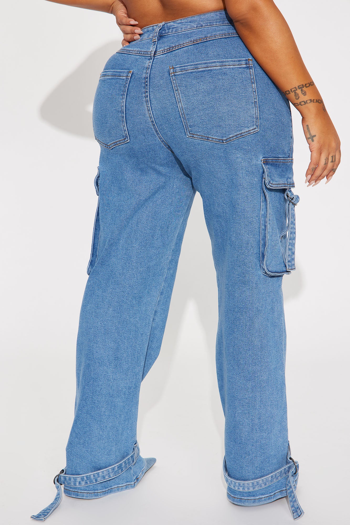 Love Hurts Ankle Strap Cargo Jeans - Medium Blue Wash