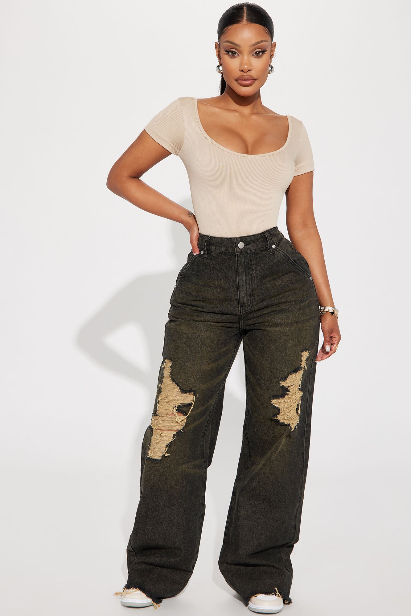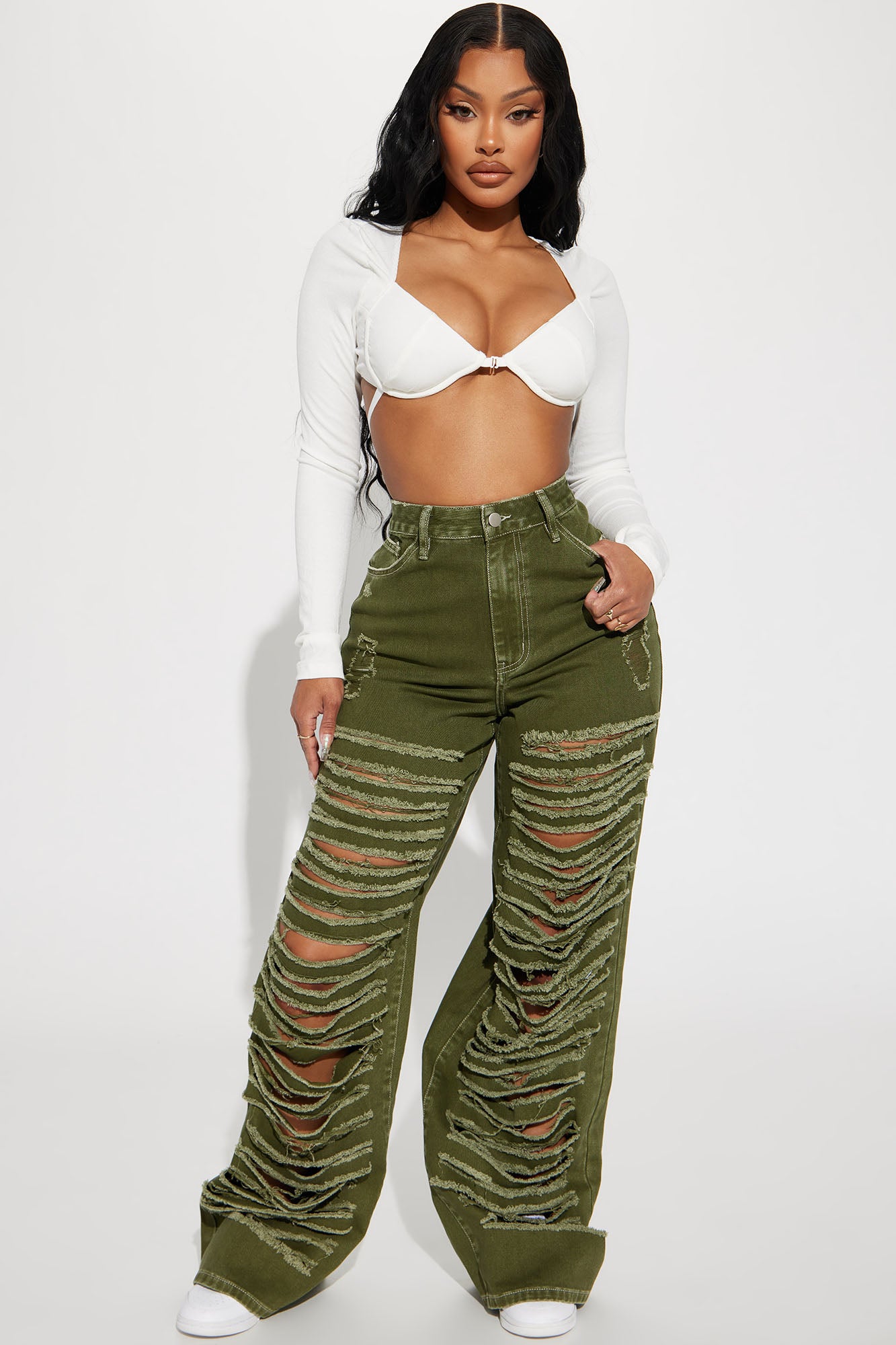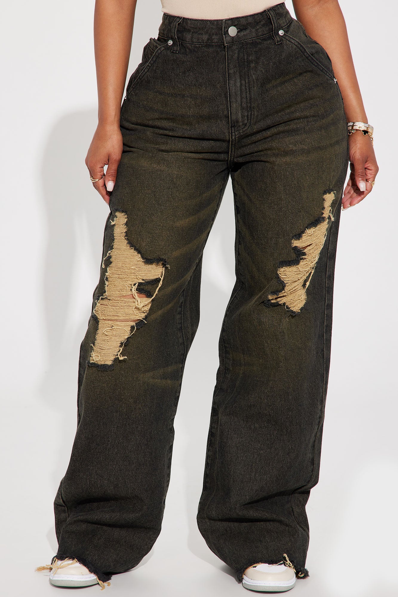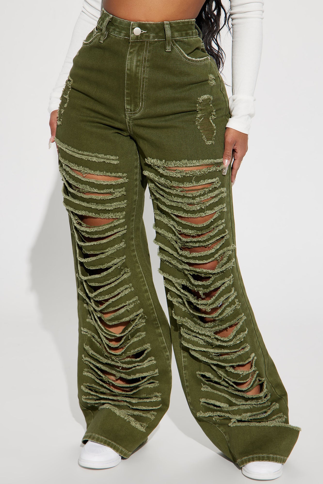 Big Dreams Non Stretch Ripped Wide Leg Baggy Jean - Olive