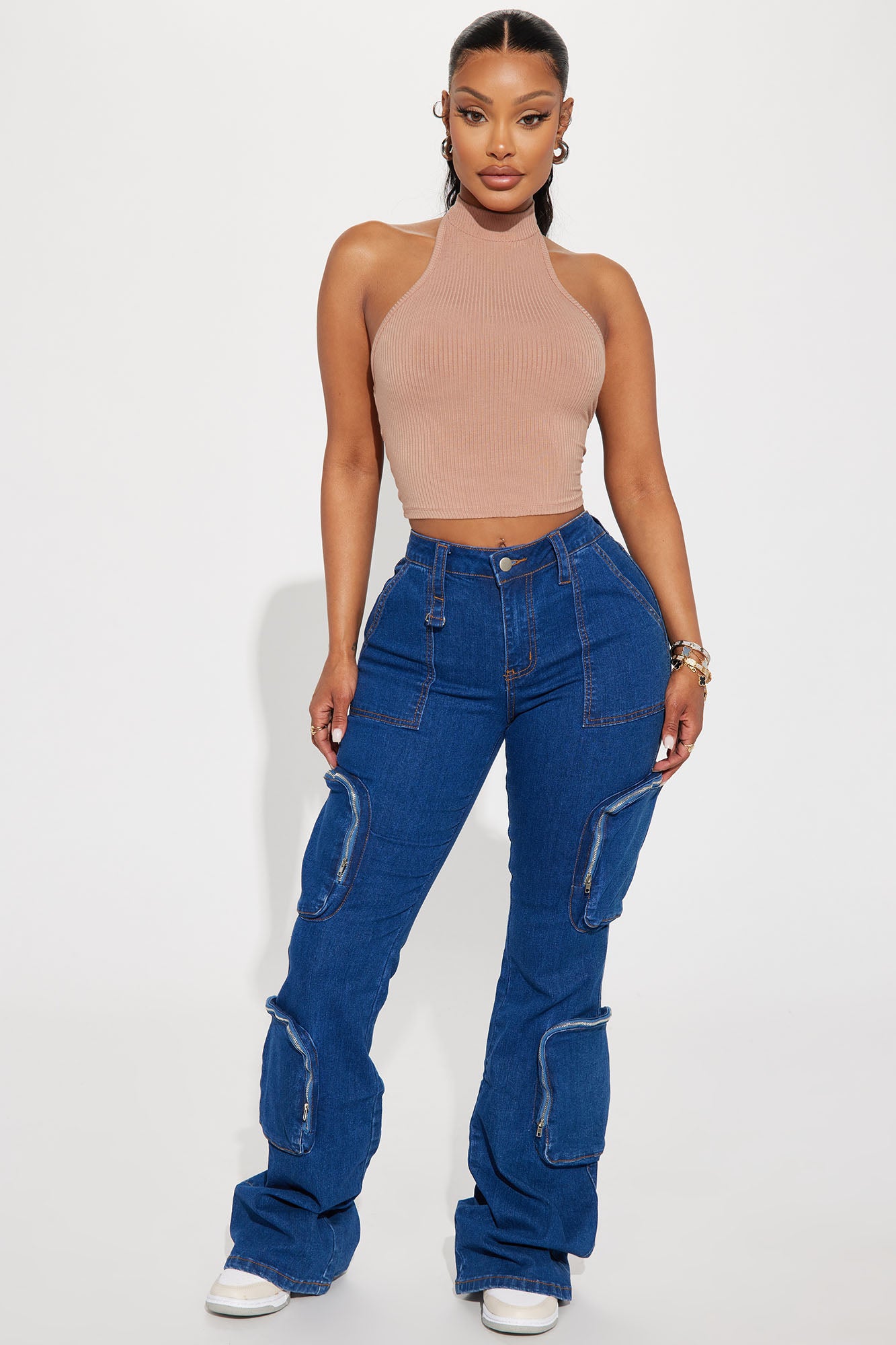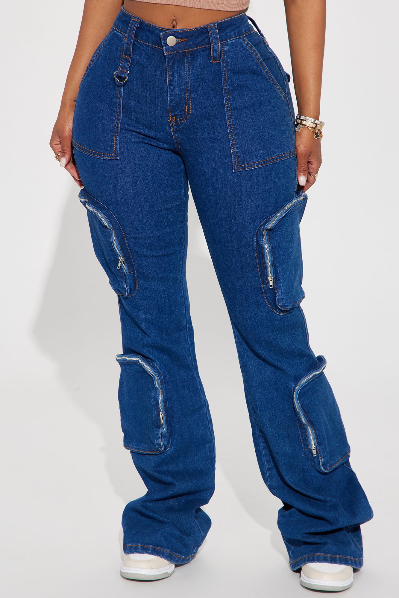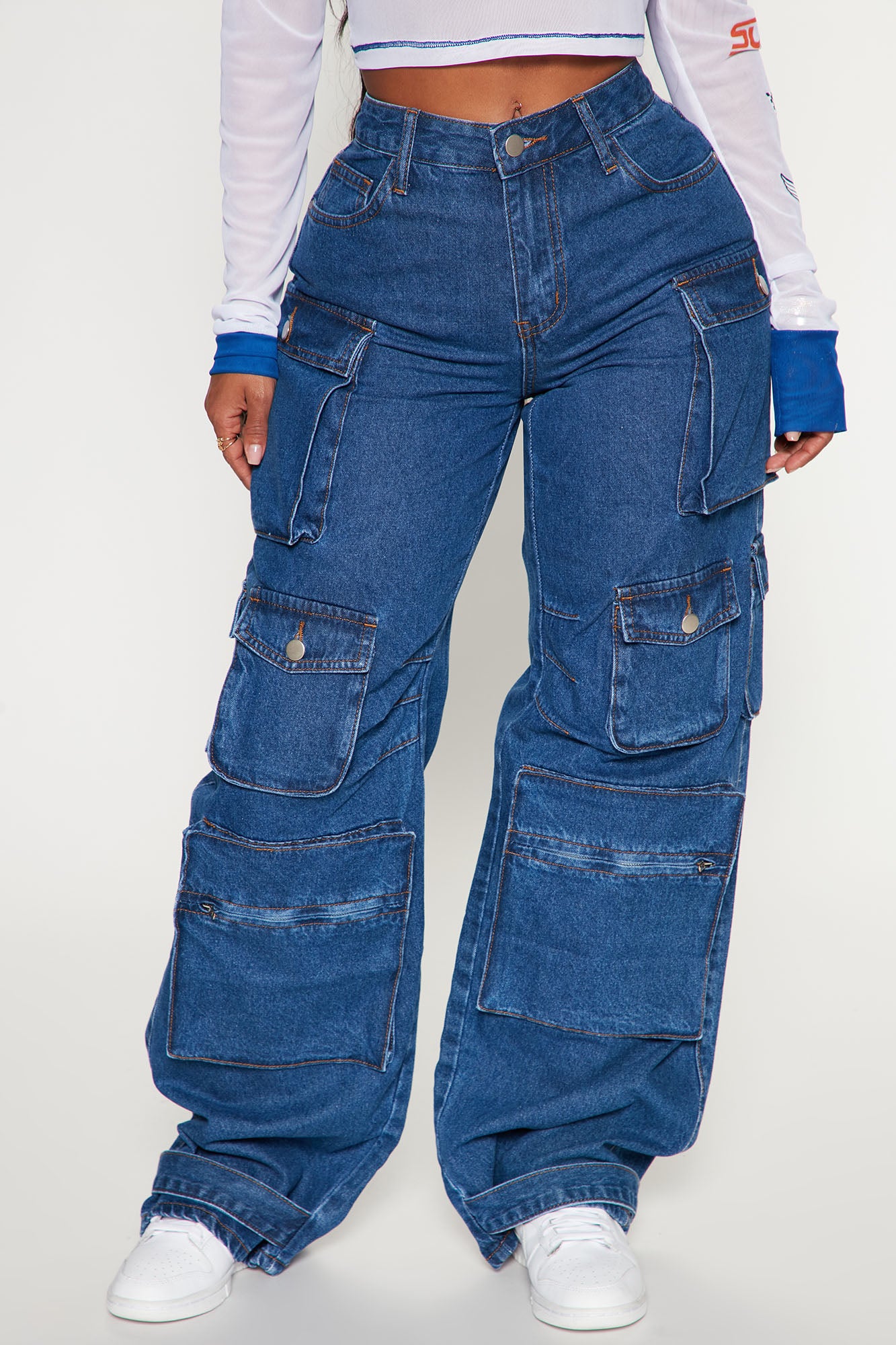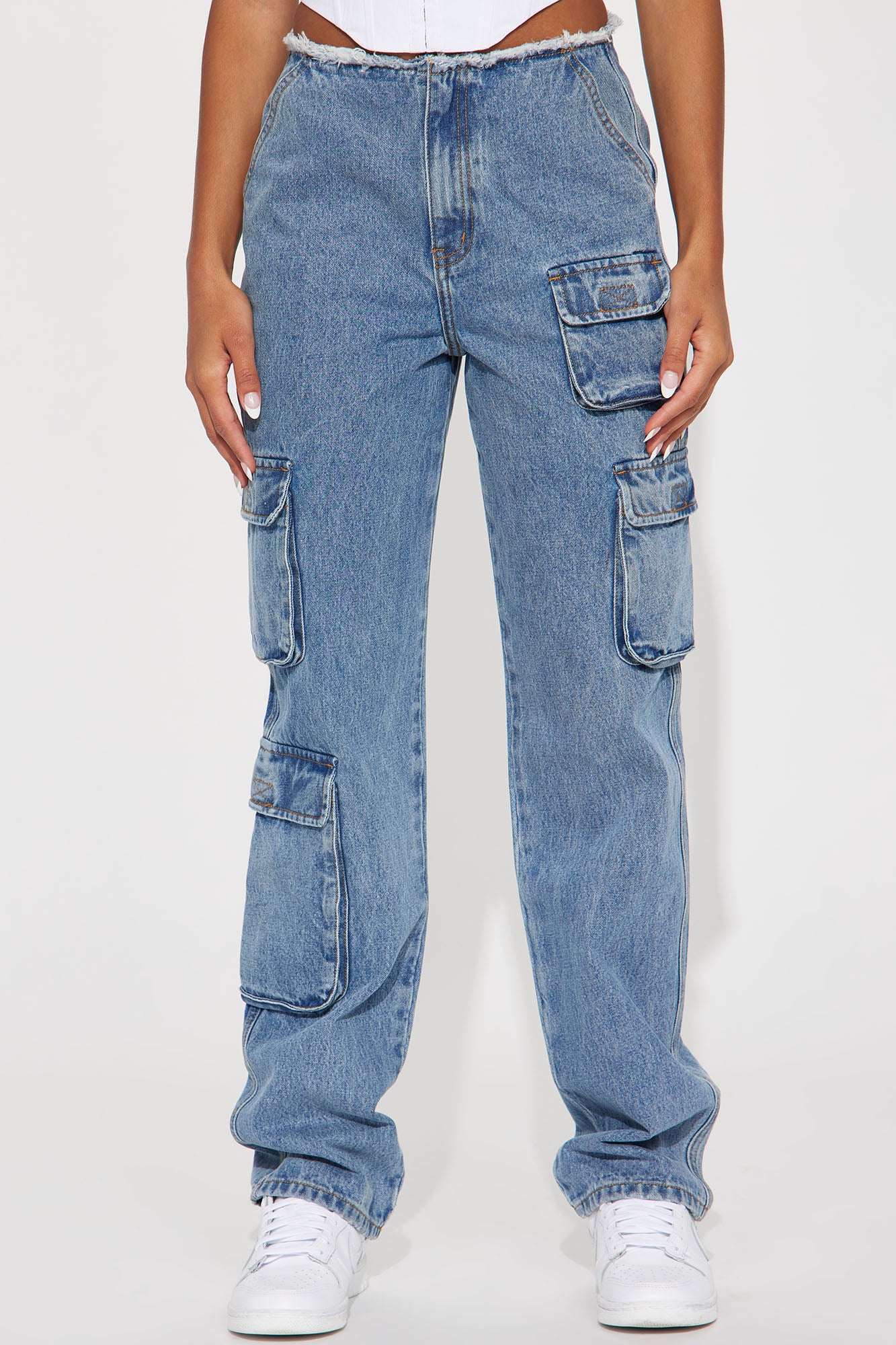 Carly Cut Off Waistband Cargo Jeans - Medium Wash