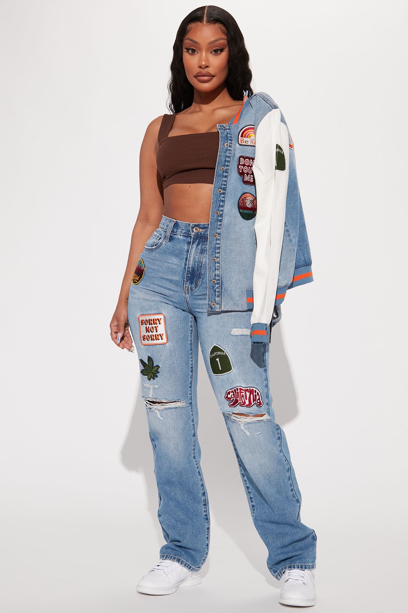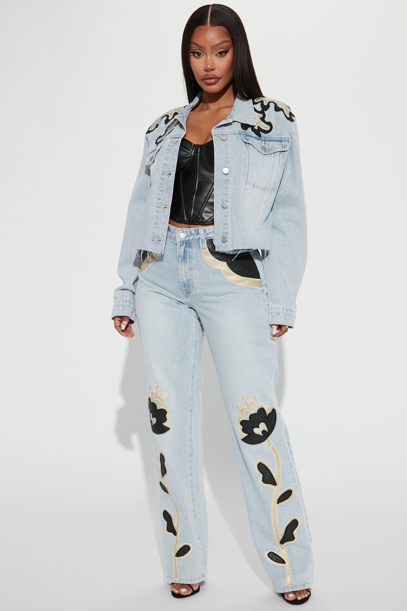 Charley PU Patch Straight Leg Jeans - Light Wash