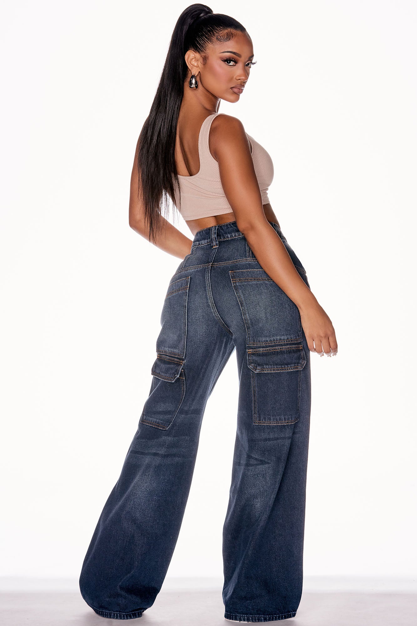 Causing Trouble Mid Rise Stretch Cargo Jean - Dark Wash