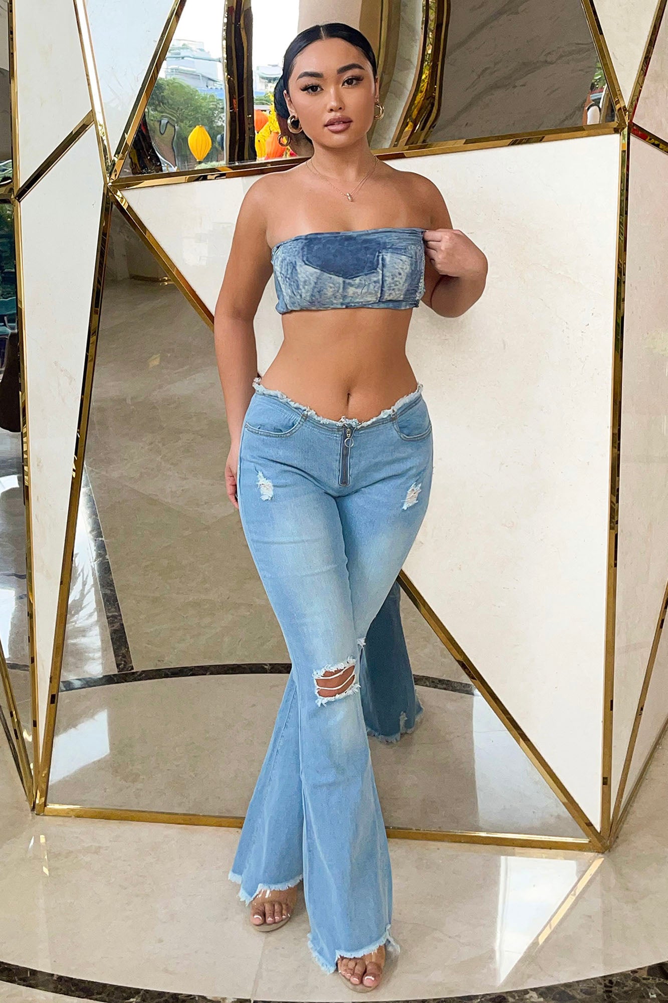 Britney Low Rise Ripped Flared Jeans - Light Blue Wash