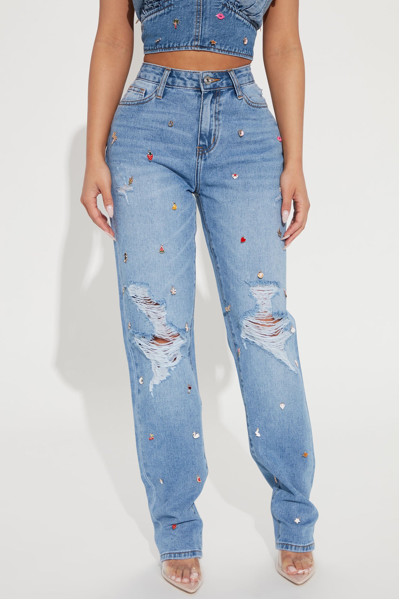 Charming Non Stretch Embellished Straight Leg Jeans - Medium Wash