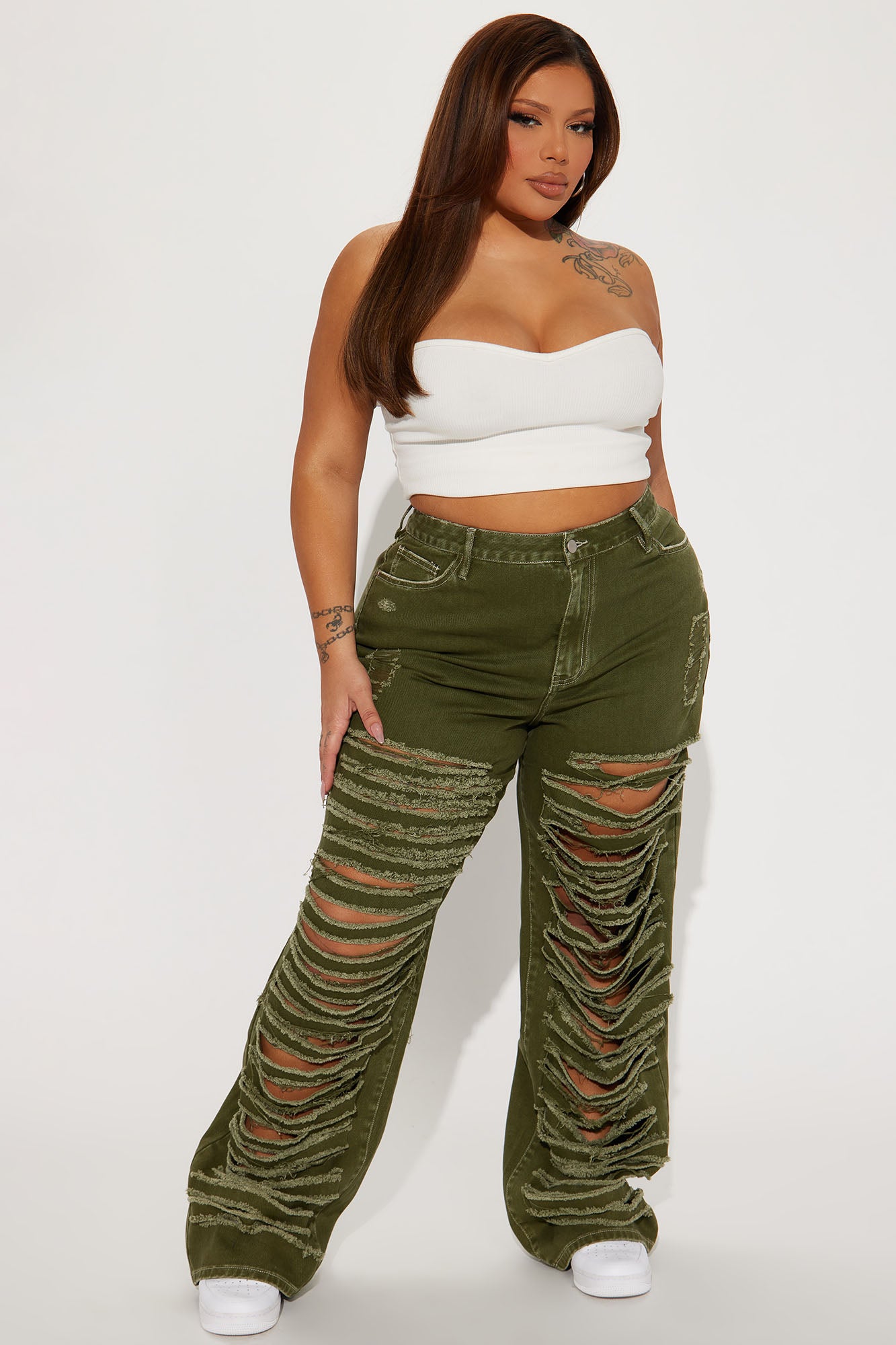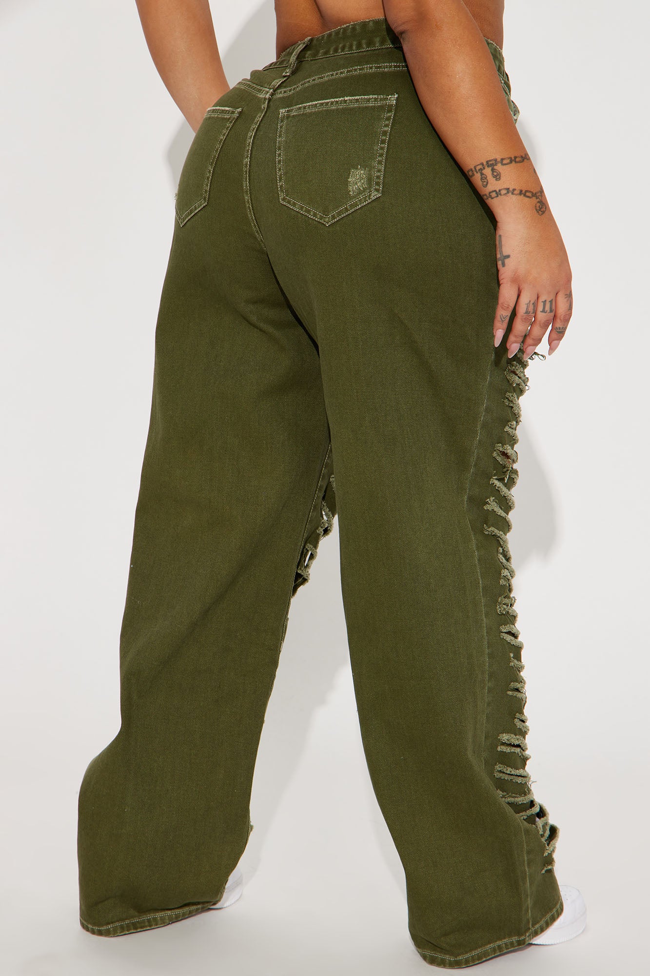 • Big Dreams Non Stretch Ripped Wide Leg Baggy Jean - Olive